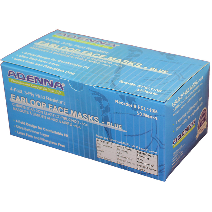ADENNA® brand earloop face masks meet the ASTM F2100-11 requirements as Performance Level 2 Barrier medical face mask.