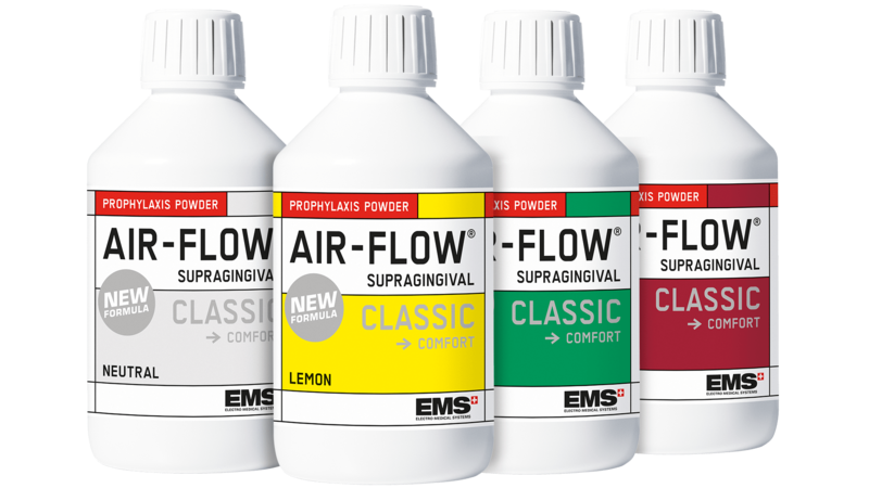 The AIR-FLOW® CLASSIC sodium bicarbonate powder has just been revamped with a new formula: the COMFORT. The granule-metric size has been reduced by almost 40% for maximum patient comfort, going from 65 µm to 40 µm. It’s pleasant, it’s tasty and equally effective at removing biofilm, stains, heavy pigmentation and young-calculus. Thanks to the reduced grain size and a variety of flavours, prophylaxis has just gotten tastier – try it, patients love it!