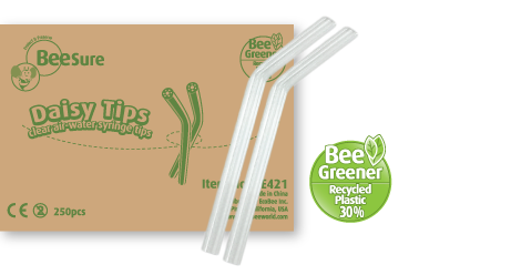 Our NEW Daisy Syringe Tips have separate air and water channels eliminating cross contamination. Made with 30% recycled plastic, the Daisy Syringe Tip costs less than traditional metal sterilization tips and serves as an excellent economical alternative. Latex-Free.