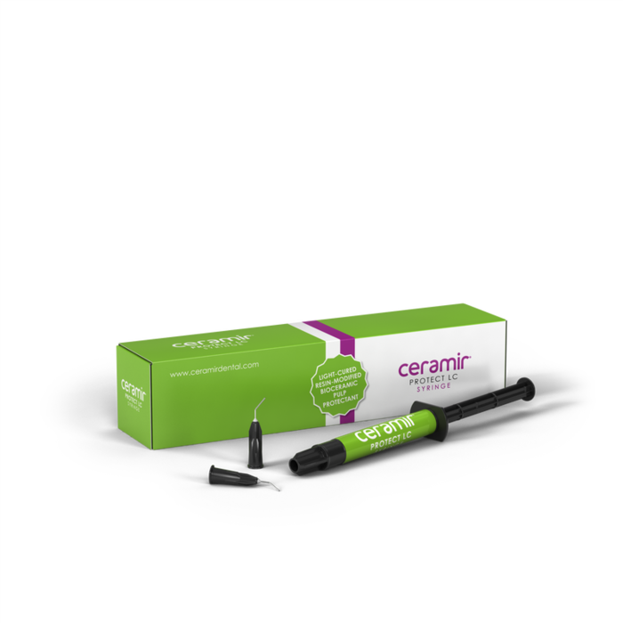 Ceramir® Protect LC - Syringe is a light-cured, resin-modified Bioceramic pulp protectant for direct and indirect pulp capping. The significant release of calcium on moist tooth surfaces promotes the formation of hydroxyapatite as well as tertiary dentin, leading to safe pulp protection. A high alkaline pH level creates an environment hostile to bacteria, which is conducive for healing and protects against hypersensitivity.