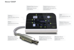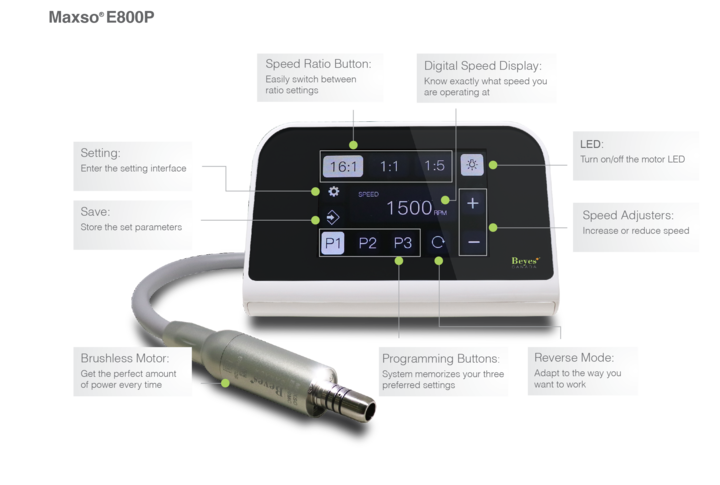Beyes® has made upgrading to the newest electric technology easy with the Maxso® E800. Equipped with a touch screen interface and 3 programmable preset speeds, this brushless electric micromotor system is designed with ultimate user-friendliness in mind. With customizable settings, the system is the perfect solution for all high-speed and low-speed applications. Its quiet motor delivers uncompromised power – featuring advanced rotational control technology, resulting in only the smoothest and steadiest operation. Integrate the Maxso® E800 into your practice with ease and start experiencing the advantages of electric today.