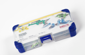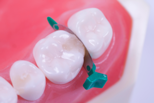 FenderMate is a pre-curved, one-piece sectional matrix and wedge that provides for quick, safe and predictable composite restorations, with a tight contact and cervical sealing. FenderMate is designed to be inserted either buccally or lingually. The matrix reaches from the base of the wedge to just above the occlusal surface. The side of the wedge facing the adjacent tooth has an angled wing. During insertion, the wing presses the matrix firmly against the preparation, giving a tight seal at the cervical margin. To form the contact point the matrix has a pre-contoured indentation, which mimics natural contours. When rubber dam is not used, it is suggested to secure FenderMate with waxed floss.