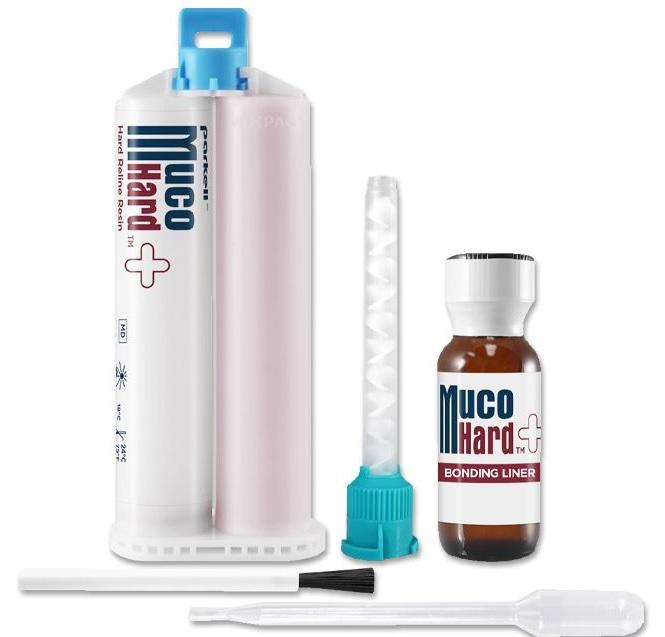 MucoHard+ is a self-cured, hard relining material used for in-office, durable long-term relines, repairs. It can also be used for additions to the borders of full or partial acrylic dentures. The Automix cartridge makes for ideal mixing. The viscosity enables easy placement and spreading, complete seating of denture base back onto the upper or lower arch and detailed capture of topography to ensure a good fit. MucoHard+ is a biocompatible, tasteless, odorless, MMA-free hard reline material for full and partial dentures. It has a low exothermic temperature for improved patient comfort during the initial intraoral self-curing stage, and when set, a color consistent with the shade of the most common lab processed denture base acrylics.