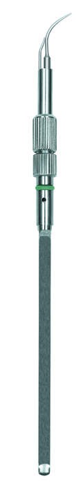 The prophy style supragingival tip is the original ultrasonic insert design with a finely beveled external water delivery tube. The Plus design features a fixed water delivery tube in a lightweight resin handle.