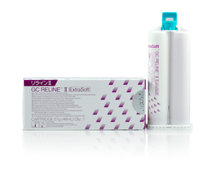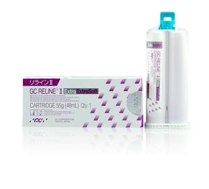 GC RELINE II is a soft denture relining material designed for denture wearers who cannot tolerate conventional hard acrylic denture reliners. Soft denture reliners are typically used for denture patients exhibiting thin, relatively non-resilient mucosa or severe alveolar bone resorption. While soft liners are more comfortable for these patients, they often easily peel from the periphery of the denture and are difficult for the dental professional to grind and adjust. GC Reline II's new vinylpolysiloxane (VPS) formula exhibits improved adhesive characteristics as well as better grinding performance in clinical practice. The included removing solution allows for easy removal of old soft reline material and efficient removal of excess new reline material. GC Reline II may be used with resin and metal-based dentures, and when applied as directed with the accompanying Primer. The GC Reline II Introductory Kit includes one liner material cartridge, primer, remover, trimming point, finishing wheel, mixing tips, plastic spatula, disposable brushes and a technical guide