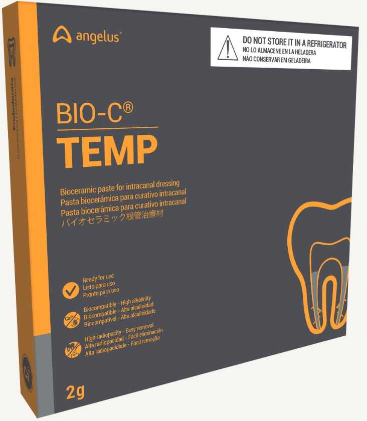 BIO-C ® TEMP is a ready-to-use bioceramic paste for intracanal dressing. Microorganisms and their endotoxins are mainly responsible for the pathogenesis of pulp and periapical infections. Consequently, one of the main objectives of endodontic treatment is to eliminate microorganisms and their endotoxins in the most extensive and effective way possible. The use of mechanical preparation, followed by disinfection with chemical agents, is the method used to succeed in the elimination of microorganisms. However, when the infection is in the acute phase and the treatment cannot be performed in a single session, a delay dressing is used between the sessions and the BIO-C ® TEMP is the material of choice. Until recently the Calcium Hydroxide paste was the only option used in temporary disinfection procedures in endodontic treatment, however, this material has some limitations. It is a material of difficult application and intracanal removal and, as a major disadvantage, has high solubility in water (1.2 gL -1 ) that causes rapid dissolution in the medium, resulting in limited clinical benefits. BIO-C ® TEMP has a great advantage over Calcium Hydroxide pastes because it presents low solubility and thus allows the product to be in contact with the canal walls for a long period of time. As a result, a high release of hydroxyl ions (OH - ) is obtained in a continuous and gradual way with the increase of the pH of the fluid surrounding the application. The increase in pH plays an important role in preventing the proliferation of microorganisms through the processes of protein denaturation and destabilization of the plasma membrane