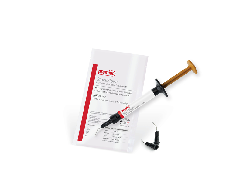 Premier introduces StackFlowTM Injectable Light-cured Composite—a versatile flowable composite with highly thixotropic behavior that delivers precise control when you want it and excellent adaptability when you need it. A proprietary hydrophobic silane treatment on nano fillers enhances dispersion and strengthens the resin–filler interface, supporting smooth handling and strong mechanical integrity.