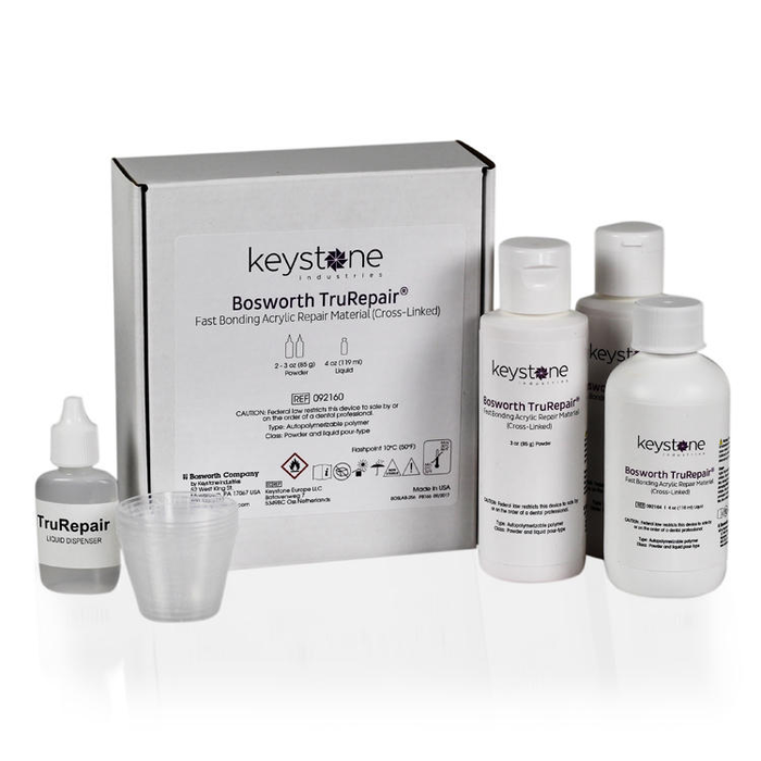 TruRepair is a fast-bonding acrylic repair material for repairing fractured dentures, dislodged denture teeth, and any additional office or lab emergency. A special internally-pigmented spherical globe of powder will blend with denture base materials to produce a color-stable match. TruRepair®’s self-curing cross-linked monomer and a PMMA powder system produces a high-strength repair and bond.